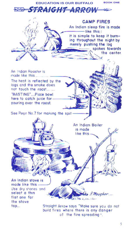 What else you would be in need if you need a camp fire while camping in the woods? Yes, some woods to burn with a proper technique to burn them for whole night. Straight Arrow is here to help you to learn this. Just keep the all the woods in a shape that log push it into center. In this card you can see how you can make an Indian stove and boiler. But be careful, as Straight Arrow warns you not to build fires where there is any danger of spreading.