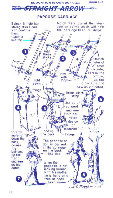 In the Comanche tribe, the newborn was wrapped and spent a few days in the tipi with its mother. The mother returned to work after placing the baby in a cradleboard. She could easily hold the cradleboard on her back or prop it against a tree so the baby could keep an eye on her as she gathered seeds or roots. Cradleboards are made up of a flat board with a basket attached to it. Rawhide straps or a leather sheath laced up the front is used for the latter. The young one was securely tucked into the leather pocket using fluffy, dry moss as a diaper. The baby was bundled in blankets and put in the cradleboard during cold weather. The baby was held in the cradleboard for ten months before being able to crawl.