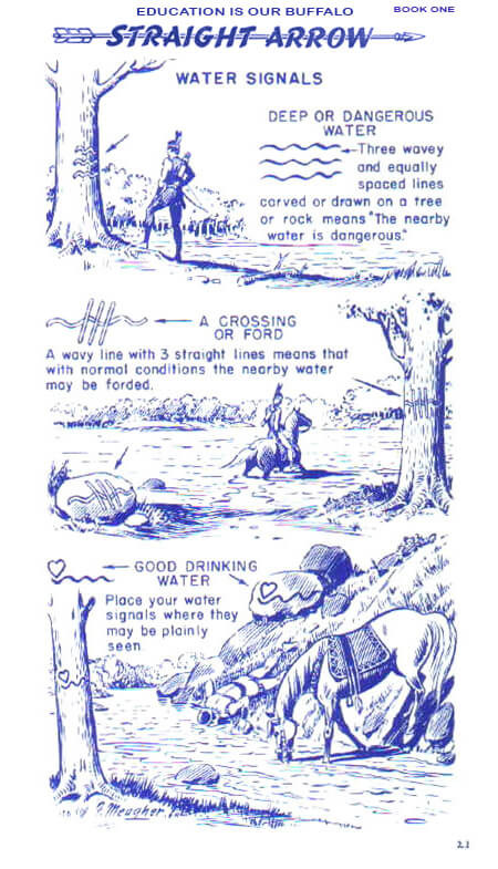 Indigenous people used different water signals. For example if there is a wave sign near a water stream its mean the water is dangerous and deep and if there is a drowning sign on water that mean it may be forded. If there is a heart on water than its mean the water is drinkable. Such signs were made by indigenous tribes on trees or stones near water to convey message.